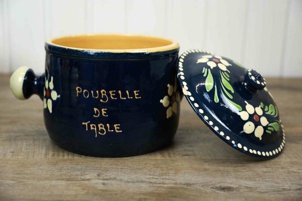 Brocante "Poubelle de table" Aardewerk pot met deksel. Mooie blauwe Brocante aardewerken pot met deksel. Poubelle de Table is een tafel vuilnisbakje. Mooi voor in de keuken of zet er een leuke plant in.
