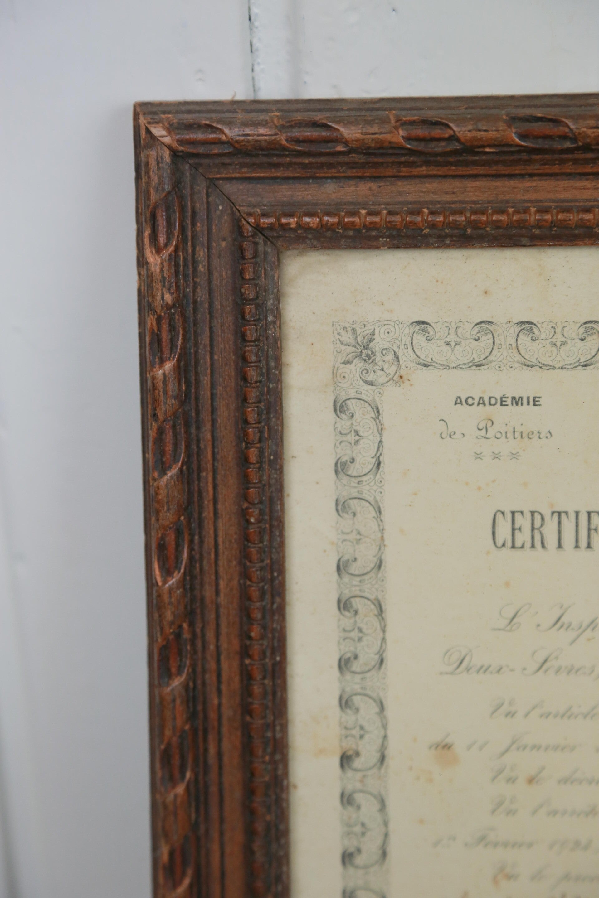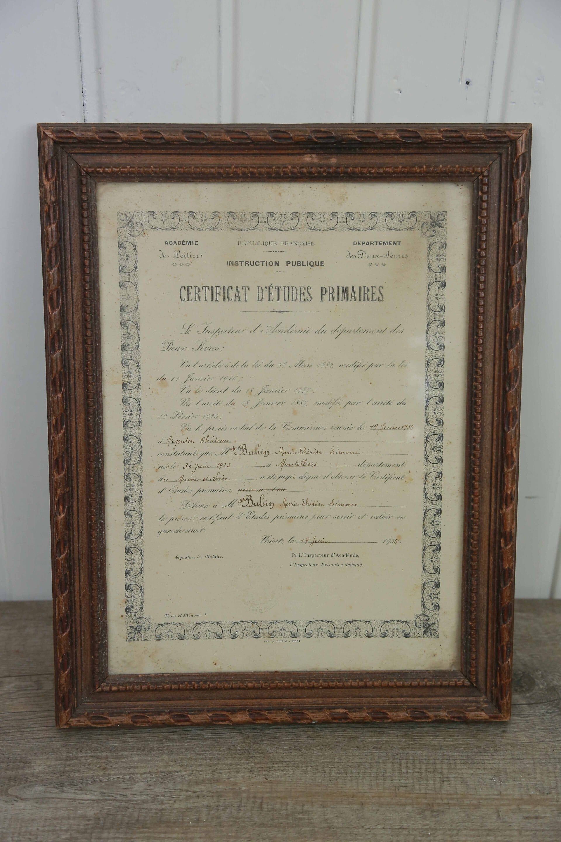 Certificaat van de franse lagere school in een schitterende lijst. Zeer leuk als decoratie voor in uw huis.