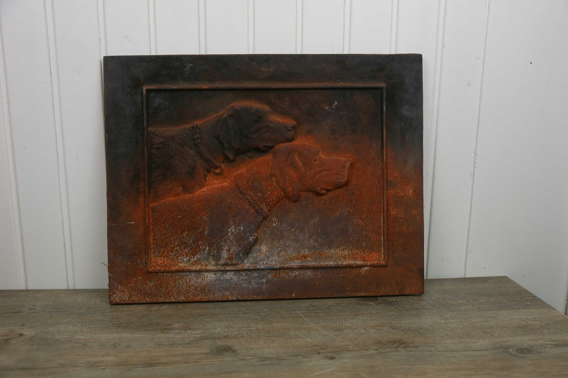 Zeer mooi gepatineerde gietijzeren haardplaat met 2 honden erop.